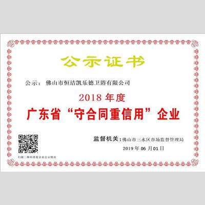 獎 項:"2018年度廣東省“重合同守信用”企業(yè) ——佛山市恒潔凱樂德衛(wèi)浴有限公司"