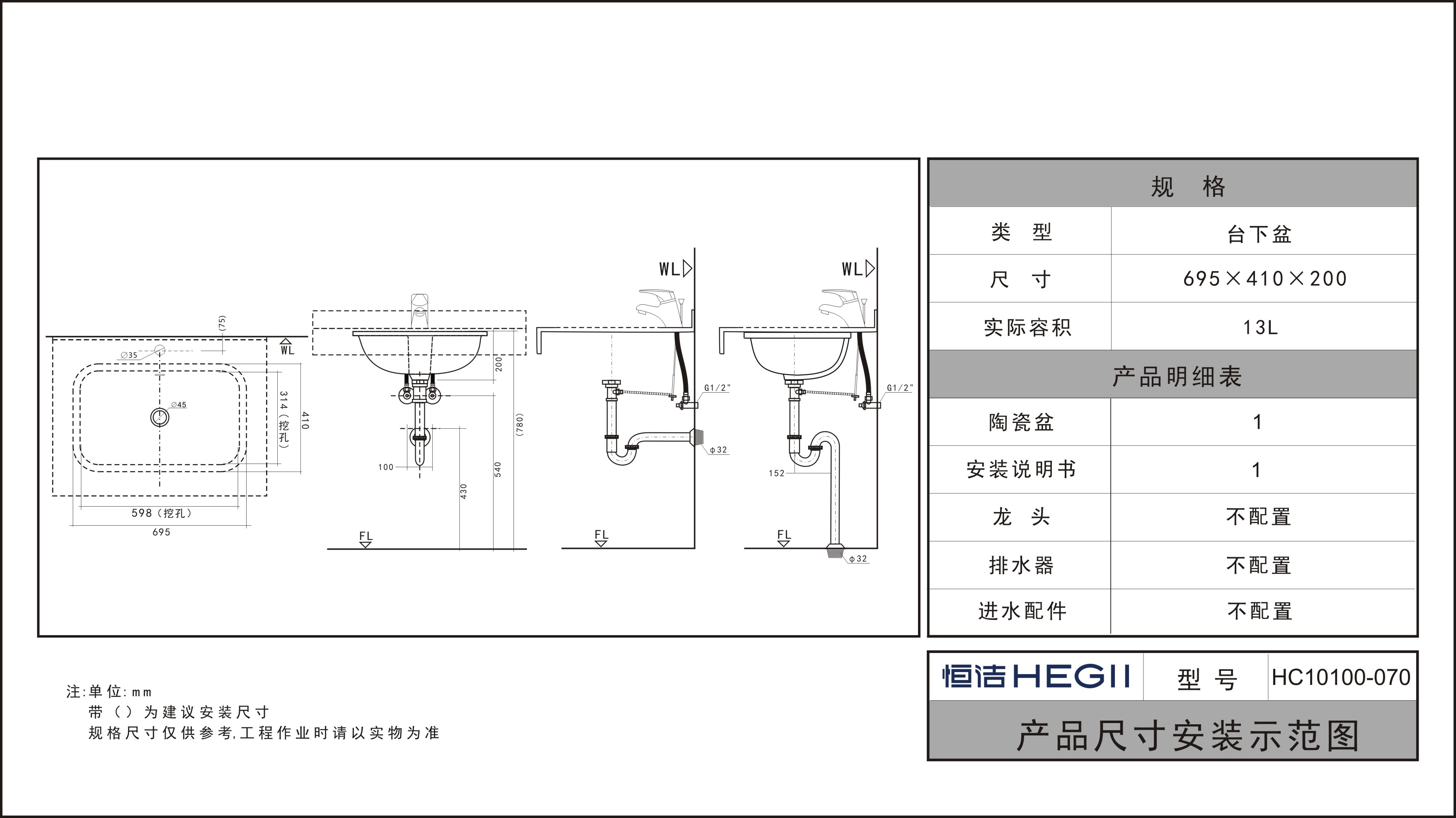 HC10100-070方形臺下盆
